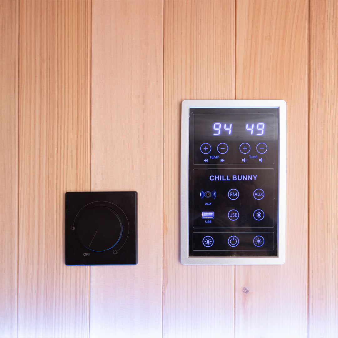 Experience relaxation and rejuvenation with the Chill Bunny 4-Person Infrared Sauna. Crafted from premium Canadian Hemlock, it features 360° Full Spectrum Infrared heating for optimal warmth. The spacious design includes a tempered glass front, recessed LED lighting, and an intuitive digital control panel. Adjustable temperature from 40°C to 65°C ensures personalised comfort.