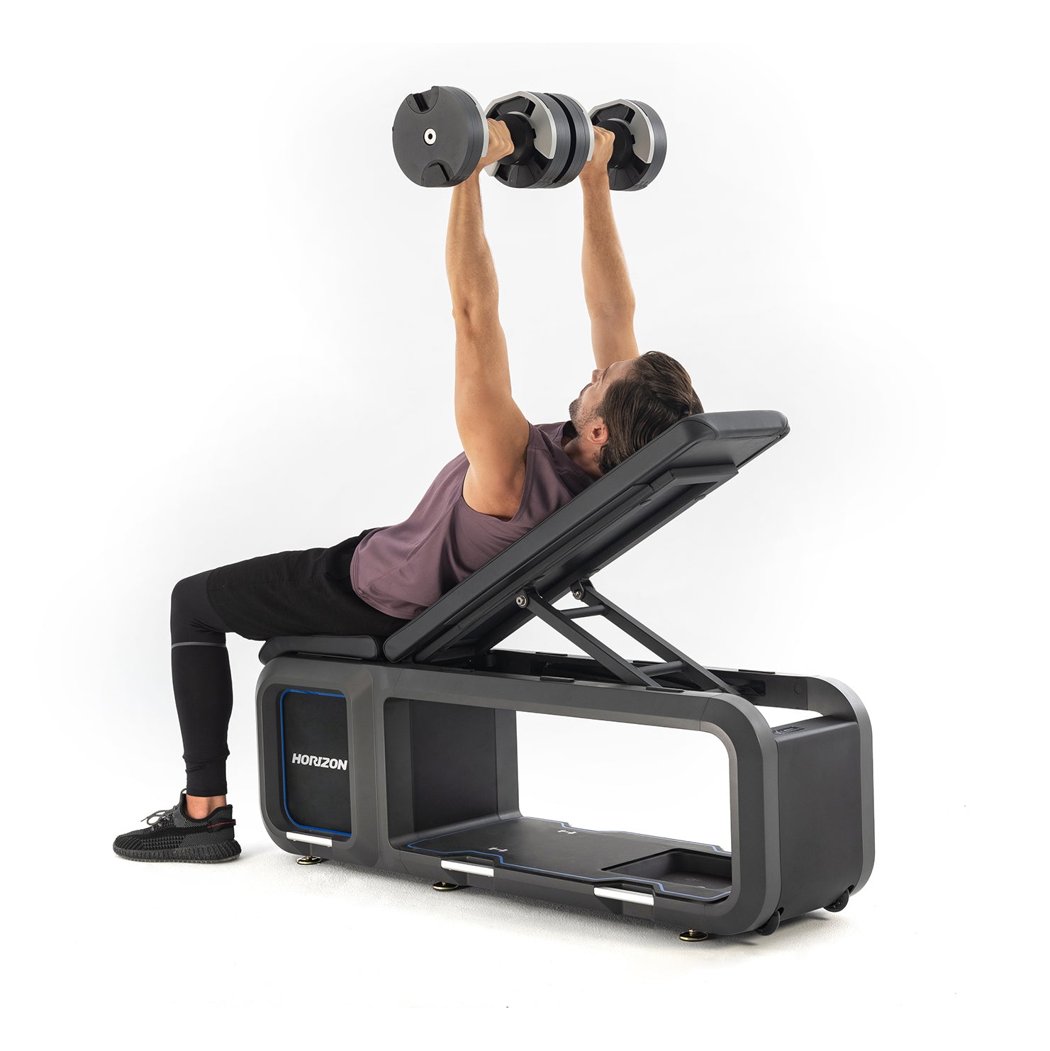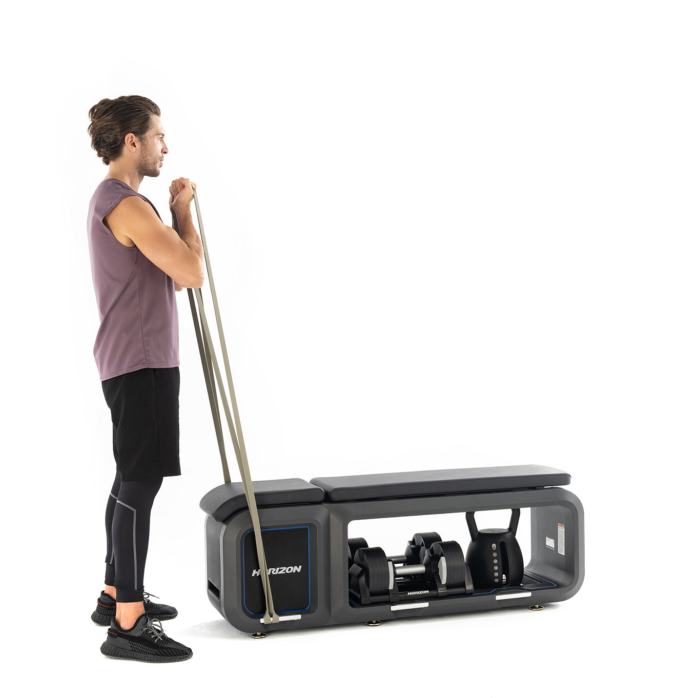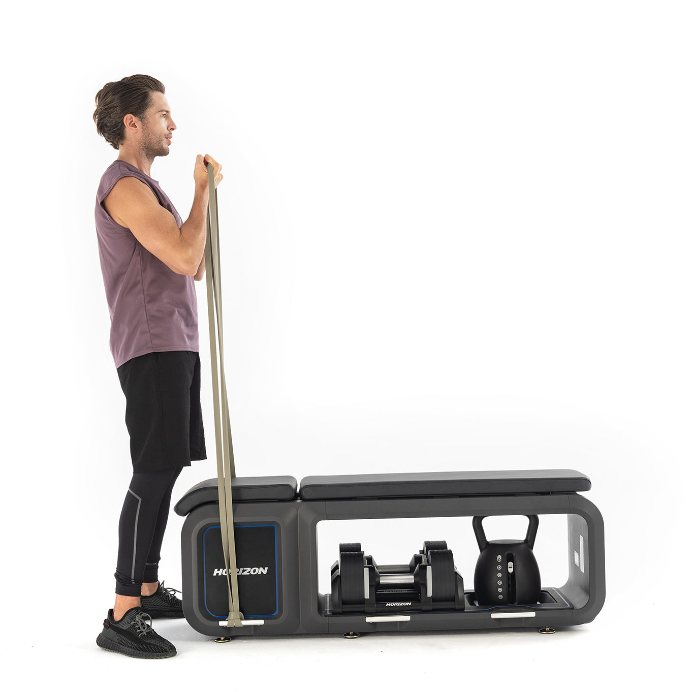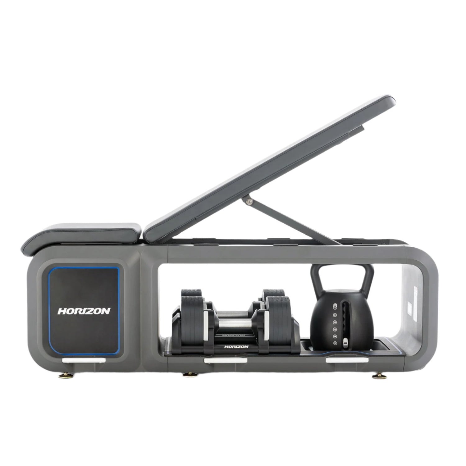 Our Horizon Bench and weights offer intuitive design for seamless transitions. The bench includes dumbbells and kettlebells that has an adjustable weight feature, combining form and function in your strength training.